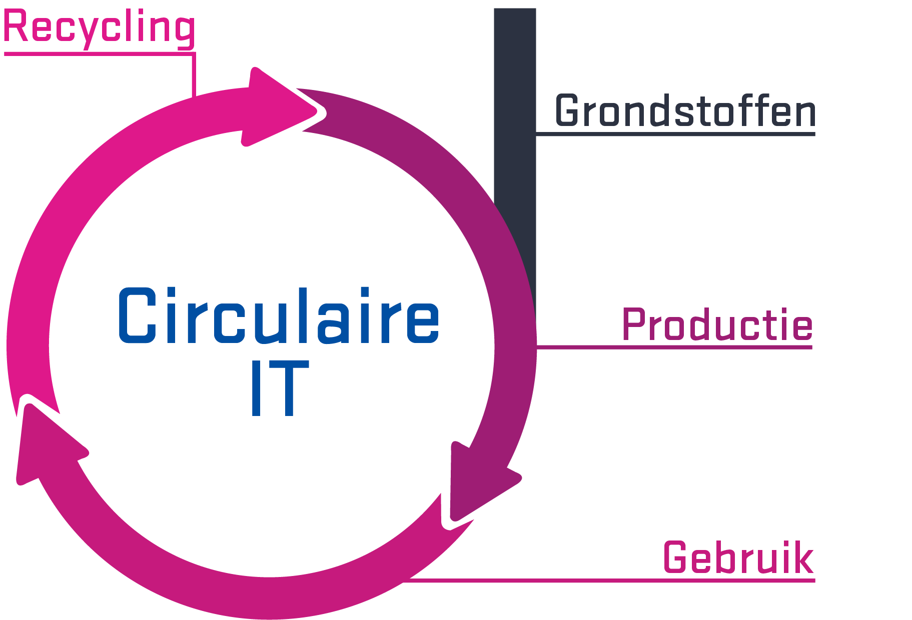 Circulaire IT: in circulaire IT worden alle (grondstoffen van) componenten en onderdelen opnieuw ingezet, zodat er op termijn geen of veel minder nieuwe grondstoffen nodig zijn voor de IT.