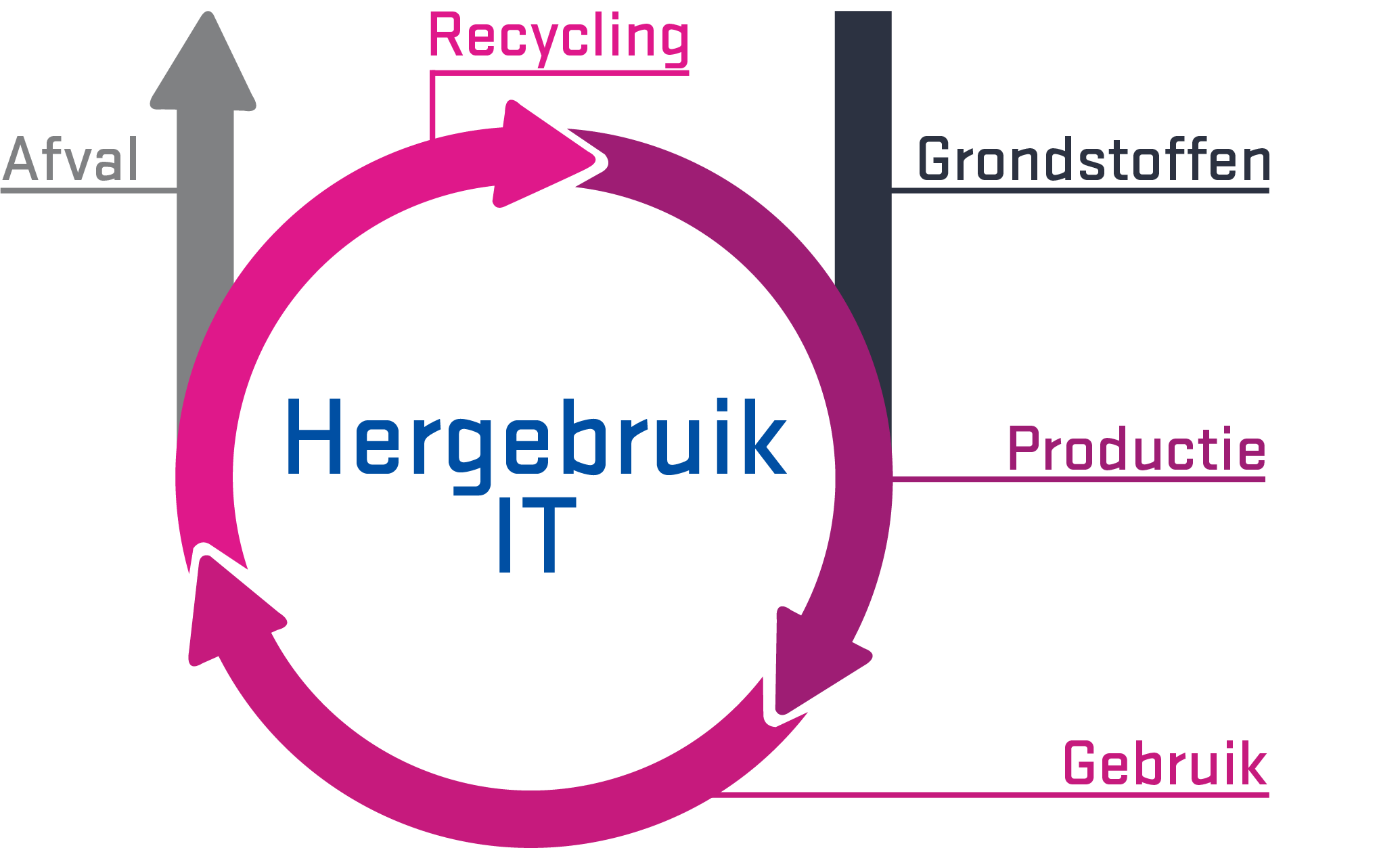 Hergebruik IT: hergebruik doorbreekt het lineaire systeem doordat onderdelen en een deel van de grondstoffen opnieuw worden ingezet. De hergebruikte onderdelen vormen samen met nieuw geproduceerde onderdelen een nieuw IT middel. Een deel belandt bij het afval.