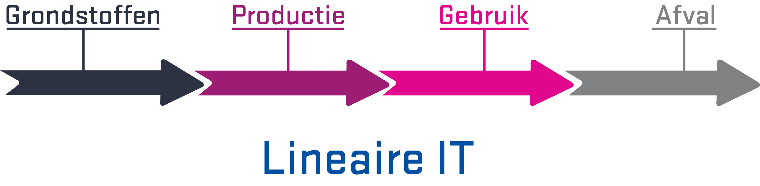 Lineaire IT: dit is de vorm die we in het verleden toepasten. En ook in het heden nog onnodig veel voorkomt. IT middelen worden geproduceerd uit grondstoffen. Na inzet wordt de IT middelen afgevoerd en belanden bij het afval.